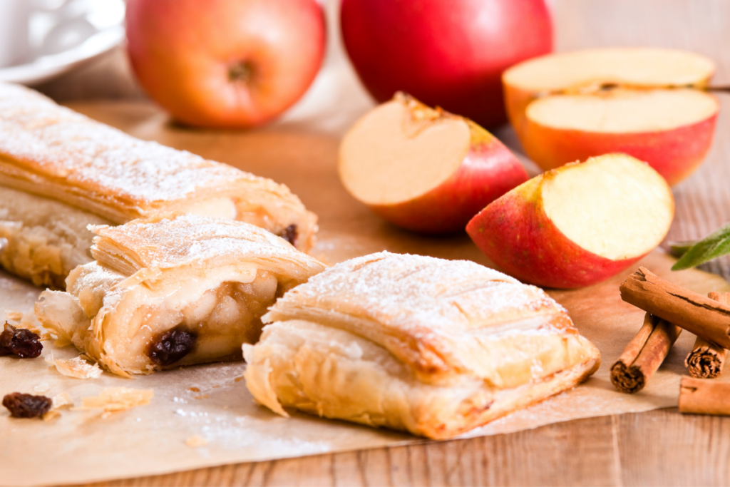 Apfelstrudel: Um clássico strudel de maçã, feito com uma massa fina e crocante recheada com maçãs, passas e canela, geralmente servido com chantilly ou sorvete.
