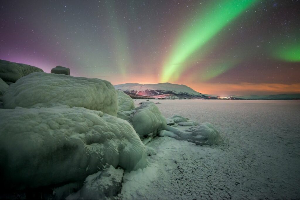 Yellowknife, nos Territórios do Noroeste do Canadá, é outro destino incrível para ver a aurora boreal. A cidade é conhecida pelo seu “Aurora Village”, um resort construído especialmente para a observação das luzes. Lá, os turistas têm a chance de ficar em cabanas confortáveis e aquecidas, enquanto aguardam a dança das luzes.
