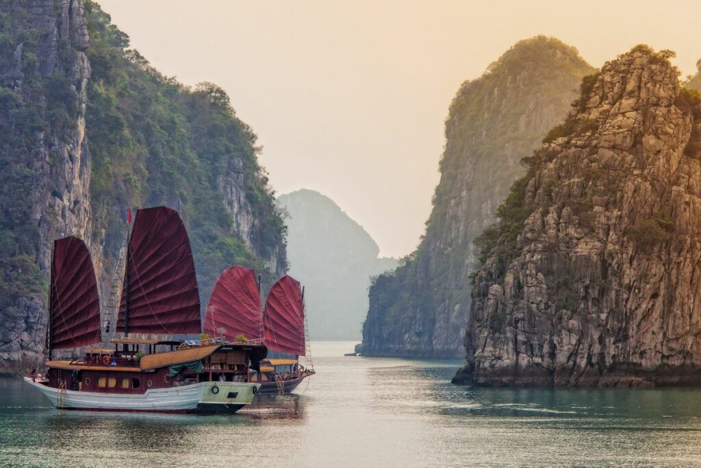 A Baía de Ha Long, no Vietnã, é um cenário de beleza mística, com suas águas esmeraldas pontilhadas por milhares de ilhas e ilhotas calcárias. As formações rochosas dramáticas, cobertas de vegetação densa, emergem do mar como esculturas naturais. Explorar a baía em um cruzeiro de junco tradicional é uma experiência inesquecível, que inclui visitas a cavernas espetaculares e aldeias flutuantes.